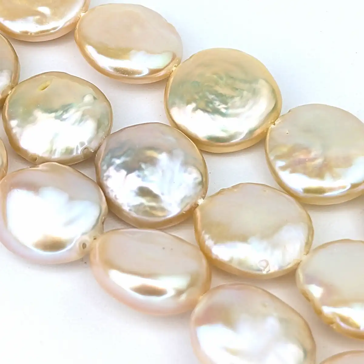 These freshwater coin pearls exhibit a wonderful lustre and a delicate flesh-pink colour. They measure approximately 13mm in diameter by 5mm thick and are generally of a consistent coin shape but with occasional variations. Being a natural product, some irregularities and bumps add to their unique character. Please see pictures as they make up part of the description.