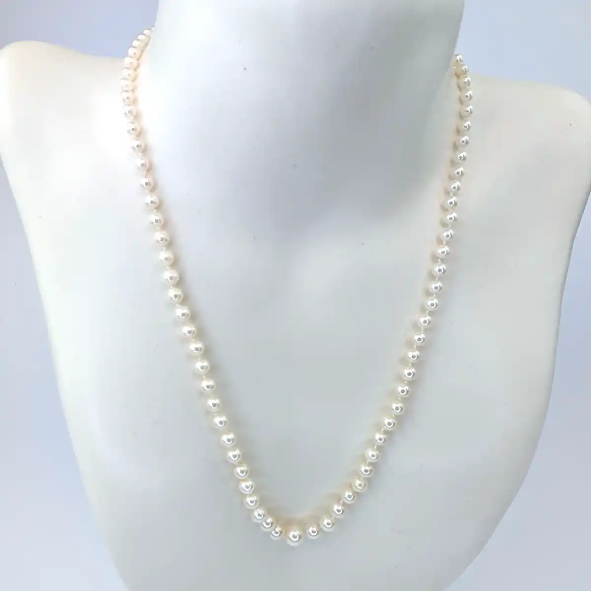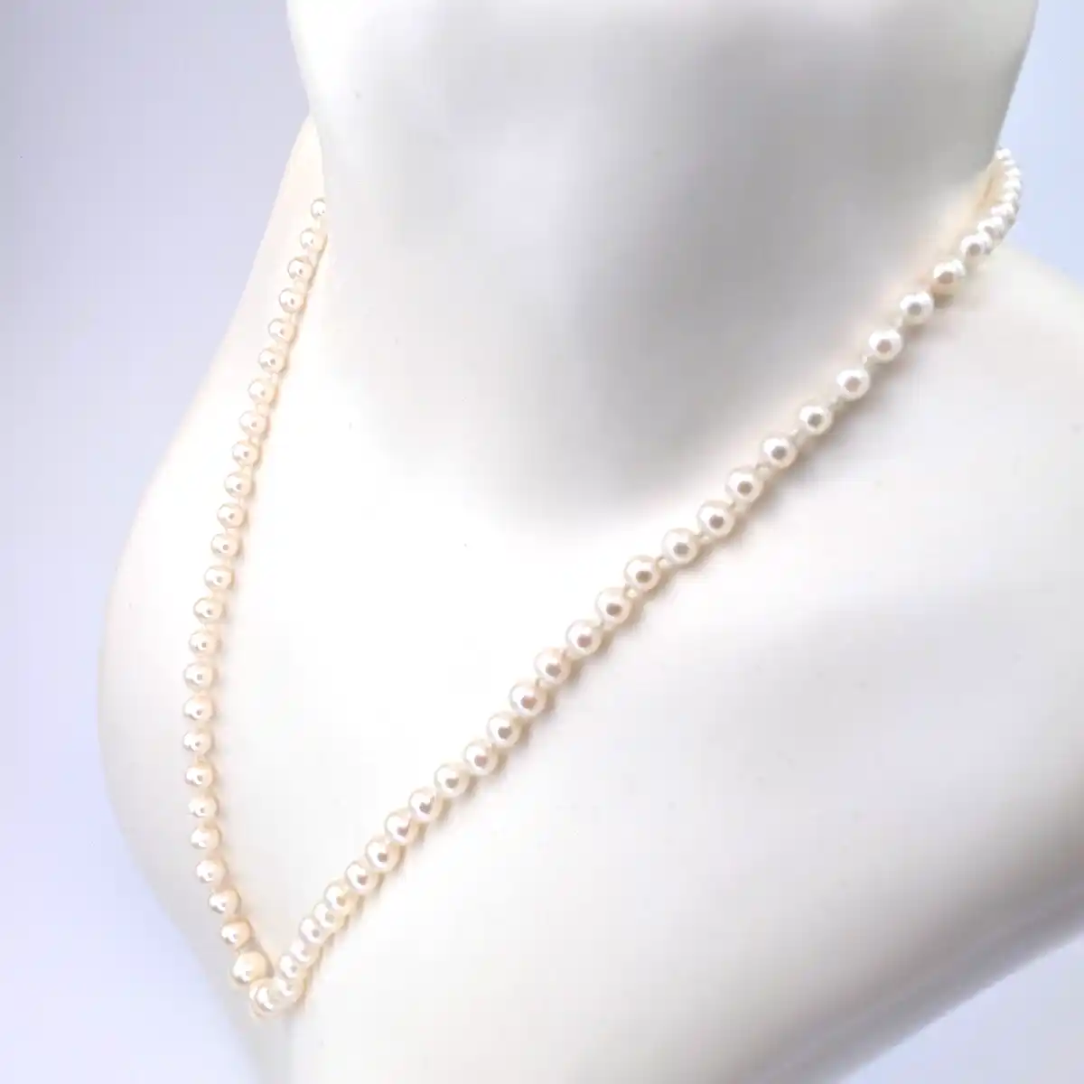 This lovely necklace has been created by our talented pearl artists using Grade A Akoya cultured pearls. The necklace features a delicate graduated design using pearls ranging in size from 3.5mm to 7mm for a subtle effect and measures 20 inches in length. The pearls have been hand-strung on a 6.5mm ridged ball clasp crafted from 9k gold. The clasp uses a tongue and clip mechanism for added peace of mind.
