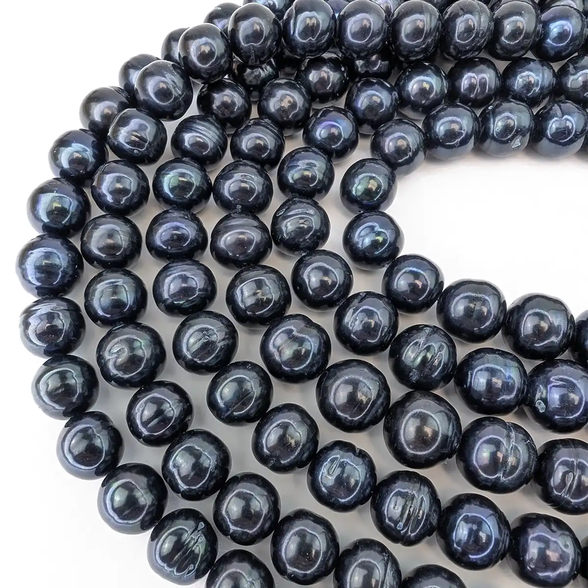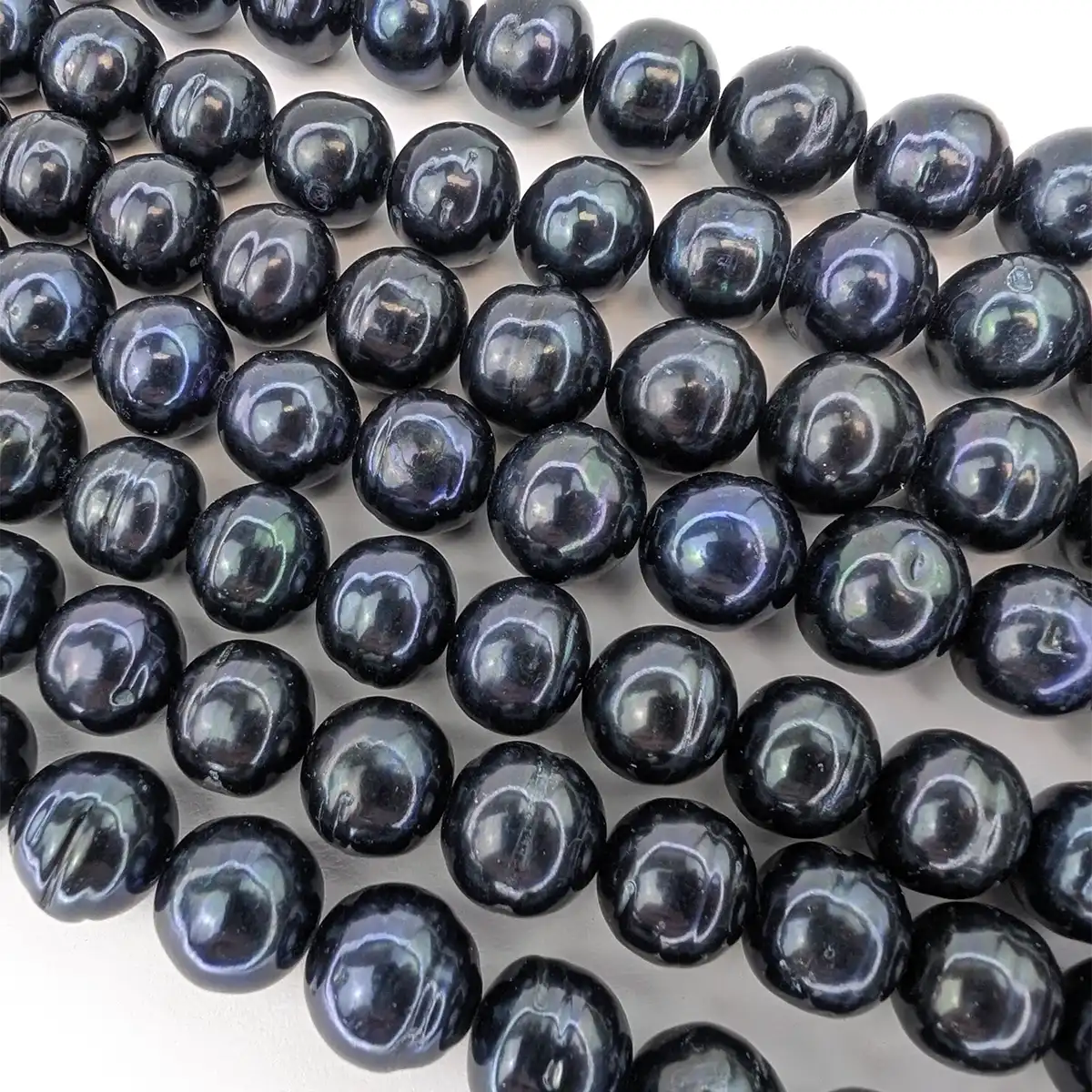 These luscious black pearls come on a graduated string, ranging in size from 11-14mm. The pearls are near-round, with heavy circumferential grooves adding a distinct character and fascination. These pearls have a good lustre and glimmer with a blue-black iridescent hue.
