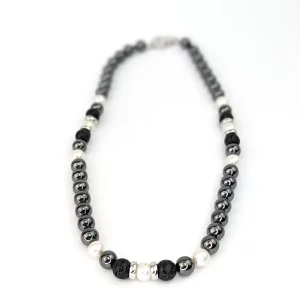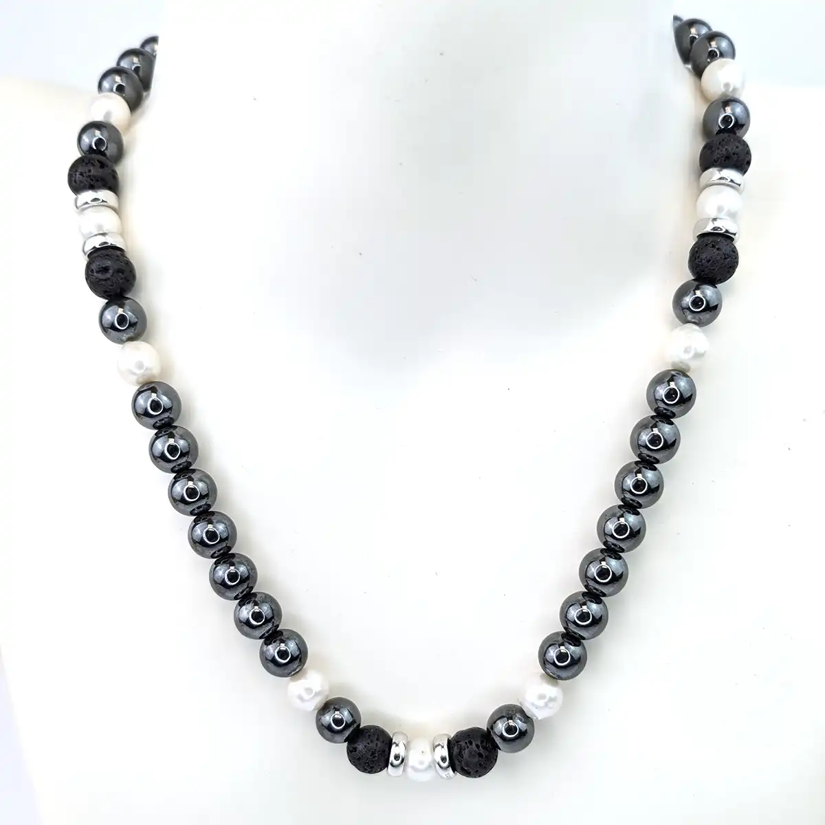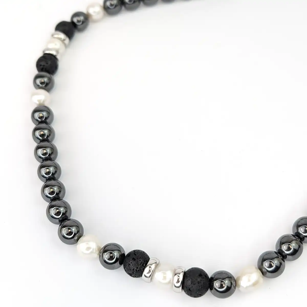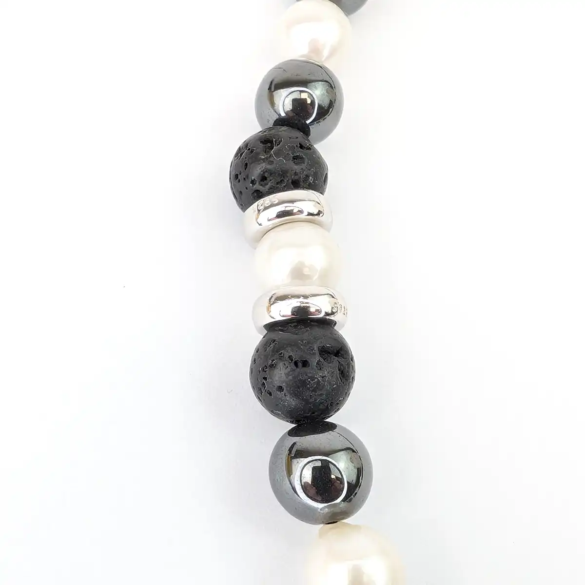 Haematite, Silver, Pearl and Volcanic Lava Rock Necklace