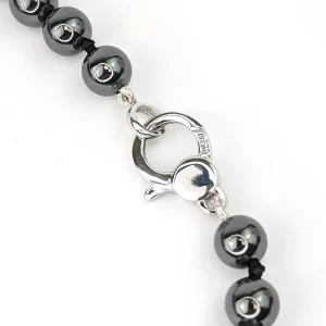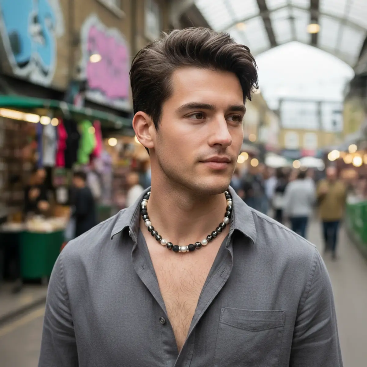 This striking 18-inch necklace has been created by our in-house designers using natural haematite, freshwater pearl, volcanic lava rock 8mm beads with sterling silver highlights and a chunky sterling silver trigger clasp. The contrasting black and white, different textures and glistening silver combine to make a stylish and sophisticated piece of masculine jewellery. See other listing for matching bracelet.