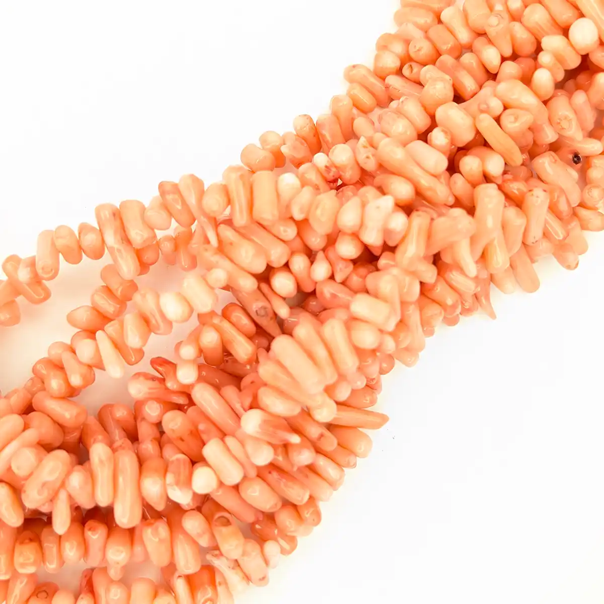 Naturally grown, smooth irregular Pink Bamboo Coral Chips from sustainable sources Size: 6-12mm (varies) x 4mm average Colour: Pale pink Drilling: Diameter-drilled, 0.8mm drill size Quantity: 1 String (unfinished) approx. 16 inches (unknotted length, will vary slightly depending on bead size). 100 beads average.